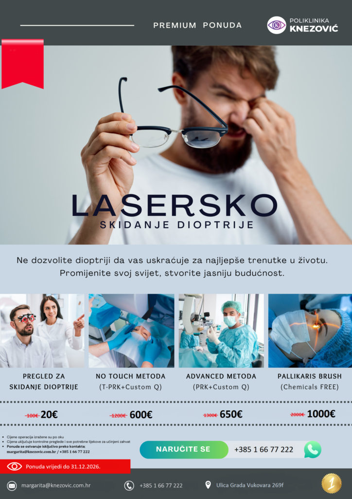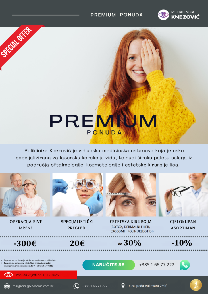 Detaljnije informacije možete potražiti na web stranici Poliklinike https://knezovic.com.hr/, a popusti se ostvaruju isključivo putem elektroničke pošte margarita@knezovic.com.hr ili pozivom na broj +385 1 66 77 222 s naglaskom da se radi o Premium ponudi.